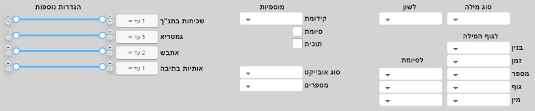 (Here we introduce another new feature. The ability to specify how exact or fuzzy one's search terms should be interpreted. See the new slider that appears to the upper-right here. If you drag that to one position before the extreme left, it will tell the search engine to include any word containing these letters in order as if one typed wildcard asterisks before and after each letter. In our example, instead of typing *ש*מ*ע*, one can simply type שמע. Within the Parts of Speech tab in the Advanced Search, one can override the exact/fuzzy setting per word)